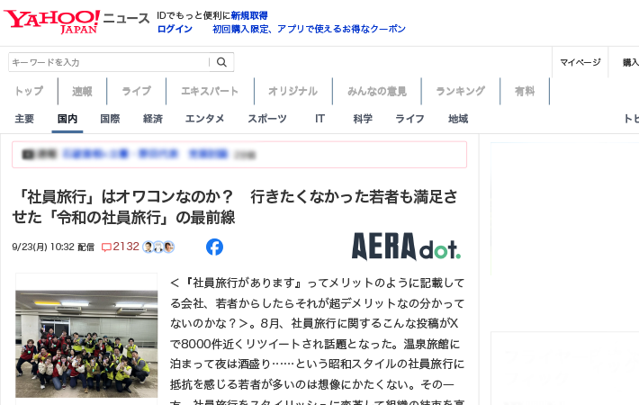 2024年9月23日、株式会社朝日新聞出版が運営するニュースサイト「AERA dot.」およびLINEヤフー株式会社が運営するニュースサイト「Yahoo!ニュース」において、弊社の社員旅行に関する取り組みが紹介されました。
